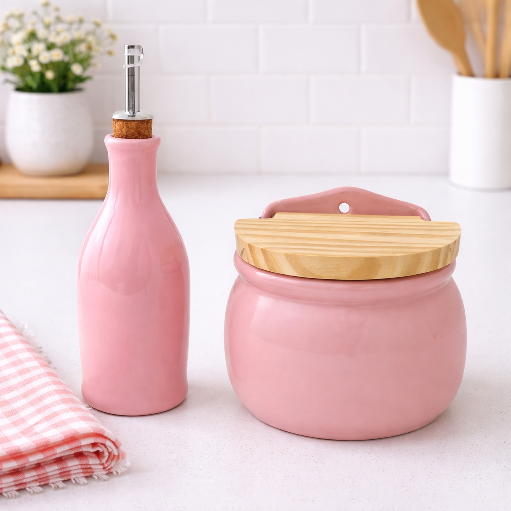 Kit perfeito composto de um porta azeite e um saleiro em cerâmica na cor rosa, um toque de sofisticação na sua cozinha. Esse lindo saleiro é perfeito para armazenar até 1 kilo de sal e ao mesmo tempo decorar sua bancada da cozinha, e o porta azeite é o ideal para armazenar 300ml de azeite ou vinagre, um charme! Sua cozinha vai ficar um mimo!